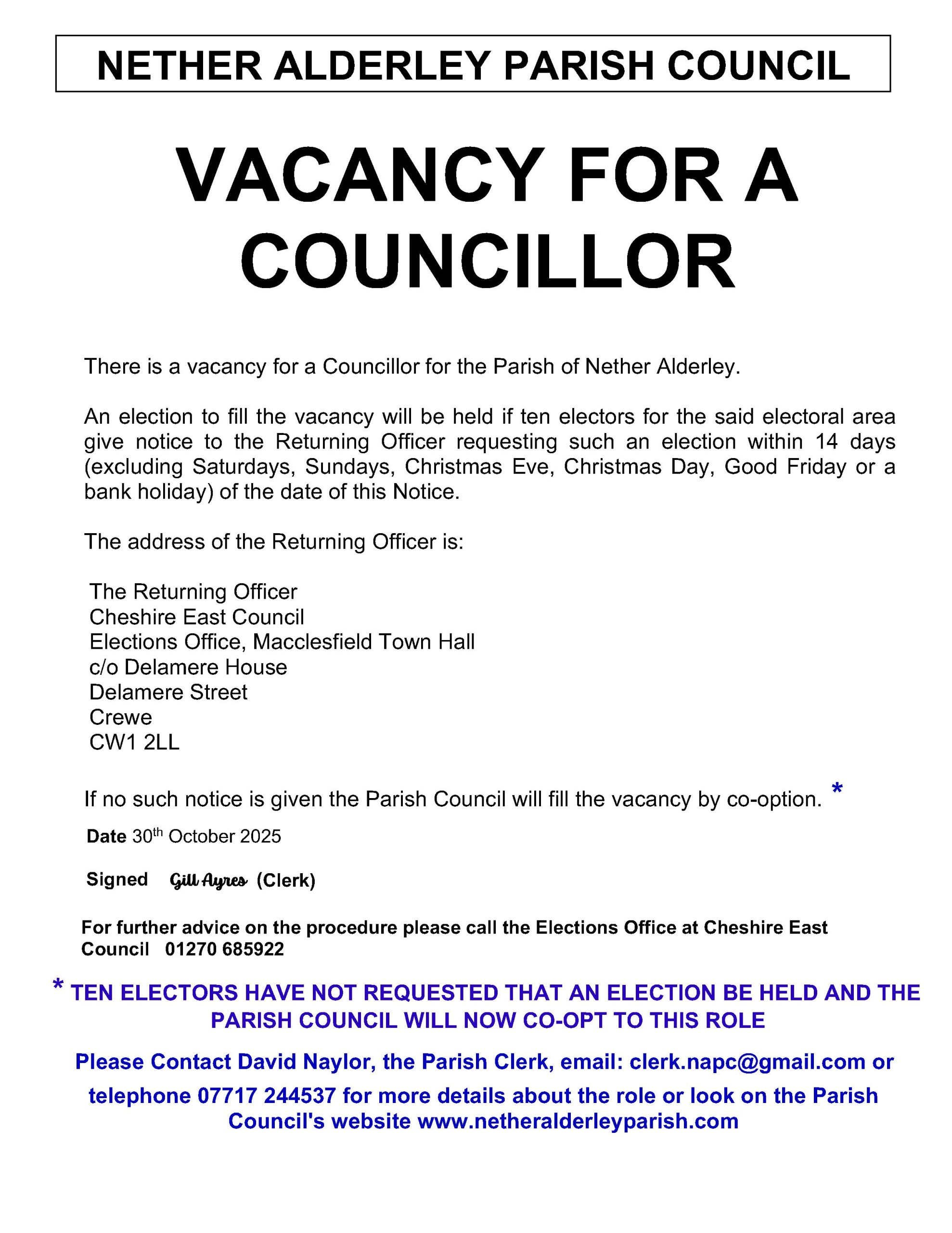We are currently looking to fill a vacant Councillor seat on the Parish Council.